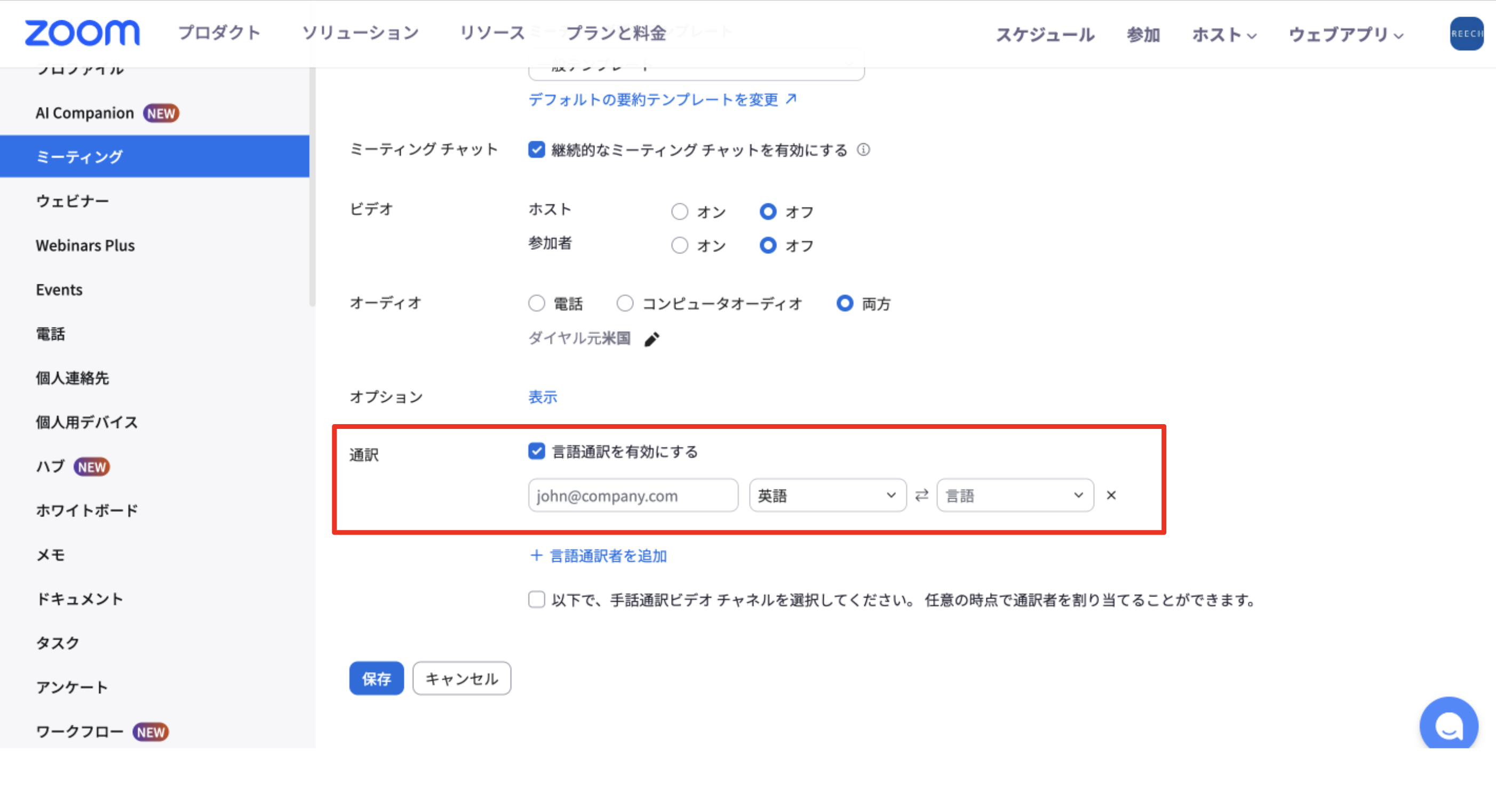 「ミーティングをスケジュール」の画面で、「言語通訳」がデフォルトでOFFに設定されている場合があります。